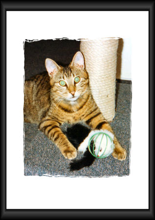 Im Herbst 2001 verschlechterte sich Romeos Gesundheitszustand rapide. Er magerte ab, obwohl er fraß. Untersuchungen konnten keine endgültige Gewißheit über die Diagnose bringen, deshalb mußte er operiert werden. Während der OP wurde der Verdacht zur schlimmen Wahrheit: er hatte inoperablen Darmkrebs und um sein Leiden nicht unnötig zu verlängern, ließen wir ihn nicht mehr aus der Narkose aufwachen. Zwei Jahre später folgte seine Schwester Julia ihm über die Regenbogenbrücke. Sie kam eines Tages nicht mehr nach Hause und auch bei ihr wurde der schlimme Verdacht zur Gewissheit: sie wurde von einem Auto überfahren. Es bleiben die Hoffnung und der Glaube, daß sie sich wieder gefunden haben. |