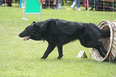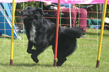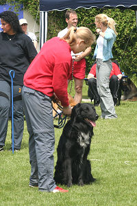 Alessa konnte den doch recht anspruchsvollen A1 Parcour (nur ein fehlerfreier Lauf) führtechnisch gut meistern, aber Charly war (wahrscheinlich auch durch das etwas gestreßte und genervte Umfeld) äußerst "gut drauf" und in diesem Zustand ist er leider noch immer sehr schwer an den Zonen zu handeln, bzw. er übernimmt dann die Regie und die heißt in so einem Fall : schnell drüber über die Zonen. Mit anderen Worten: unser "Kontaktzonenkiller" hatte mal wieder erbarmungslos zugeschlagen. Der Jumping war recht eng gestellt, leider fiel aber eine Stange, obwohl Charly noch zu retten versuchte und fast aus dem Stand über die Hürde sprang. Aber auch hier zeigten die beiden ansonsten einen sehr schönen Lauf. Nach diesem neuerlichen Kontaktzonendebakel und der Tatsache, daß wir mit Charly trainingstechnisch mittlerweile soweit waren, daß er fast keine Fehler mehr an den Zonen machte, d.h. er hatte die ihm vor Monaten noch fehlende Technik endlich erlernt, beschlossen wir, nun die letzte "Umlernphase" anzugehen. Da offensichtlich eine Fehlvernüpfung bei Charly vor liegt, nämlich Turnier = rennen, weil da wird man ja nicht korrigiert, wollten wir bei den nächsten Turnieren Kontaktzonenfehler wiederholen, also eine DIS in Kauf nehmen, um ihm zu zeigen, daß es im Turnier nicht nach seinem Kopf geht und er da machen kann, was er will. |