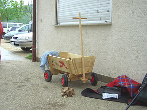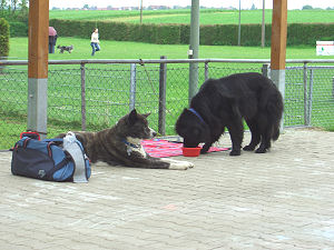 Angies Motive waren: Schnuppern an einem Futterbeutel (für eine Schleppfährte), Suchen der Schleppfährte, Aufreißen einer mit Leckerlis gefüllten Papiertüte, Ziehen eines Wägelchens und ein Gruppenfoto eines Starts eines Hunderennens. Der Futterbeutel für die Fährte war mit frischem Rindfleisch gefüllt, da roch sie natürlich gerne dran, was allerdings den Sabber des Fundis anregte und mich veranlaßte mal wieder mit dem Sabbertuch am Angielie rumzuwischen. Die Arme dachte sich bestimmt ihren Teil *g*. Aber man (Frau) wollte ja schließlich einen nichtsabberverschmierten Fundi auf den Fotos. Anschließend habe ich die Schleppfährte gelegt und Angie durfte sie suchen. Das hat sie supertoll gemacht, obwohl wir schon längere Zeit keine Fährte mehr gesucht hatten. Zur Belohnung gab's am ende der Fährte das Rindfleisch. Auch die Aufgabe eine Papiertüte aufzureißen, um an die Leckerlis innendrin ranzukommen, hat sie prima gemeistert, obwohl sie zwischendrin einmal zu mir kam und Hoffnung hegte, daß ich die Tüte aufmachen solle. Ich hab sie dann zurück geschickt und sie hat mit Erfolg weiter probiert. Das Wägelchen ziehen war erwartungsgemäß nicht mit Schwierigkeiten verbunden, da sie im Winter schon ab und zu mal einen Schlitten gezogen hat. Sie duldete sogar, daß wir ein Tibet Terrier Mädchen in den Wagen gesetzt haben und sie Wagen samt Hundeinhalt zog. Beim Gruppenfoto gab es auch keine Probleme, Angie ist sehr verträglich und so meisterte sie auch das mit Bravour. Wir hatten einen schönen Tag und ich bin schon sehr gespannt auf die Fotos, die im Buch zu sehen sind. |